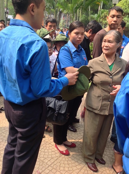 | Trời nắng, thanh niên tình nguyện nhường mũ cho một cụ bà. Thế nhưng bà cụ đa từ chối. Bà nói: "Cháu còn phải đứng nắng lâu hơn hơn bà, cháu cần mũ hơn". Hình ảnh này đã khiến những người xung quanh rất cảm động. |