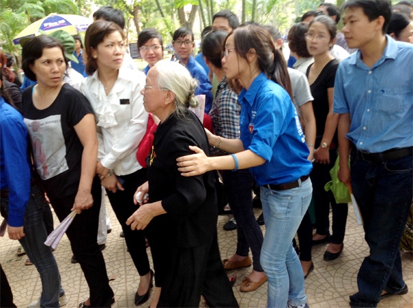 | Các bạn trẻ dìu một cụ bà lên hàng đầu do cụ đã quá yếu. |