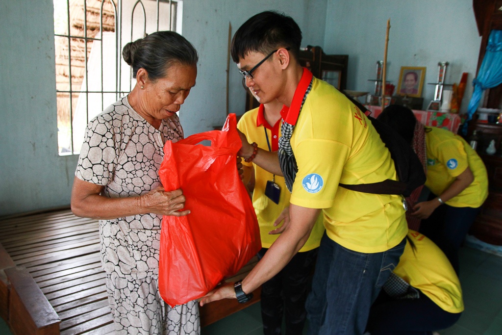 | Các thành viên tặng quà cho một gia đình chính sách. Phần quà gồm nước tương, đường, bánh chưng, mứt, dầu ăn… được đội mua từ tiền quyên góp được trong những ngày trước. |