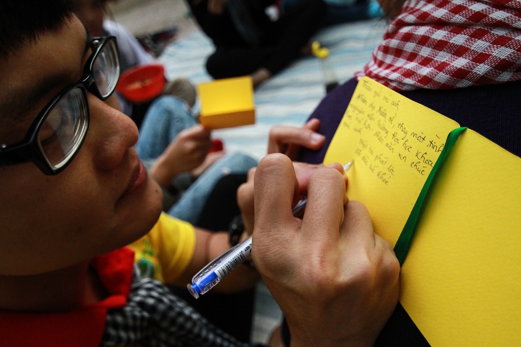 | Sinh viên Lê Phước viết thiệp chúc Tết các anh bộ đội biên phòng. |