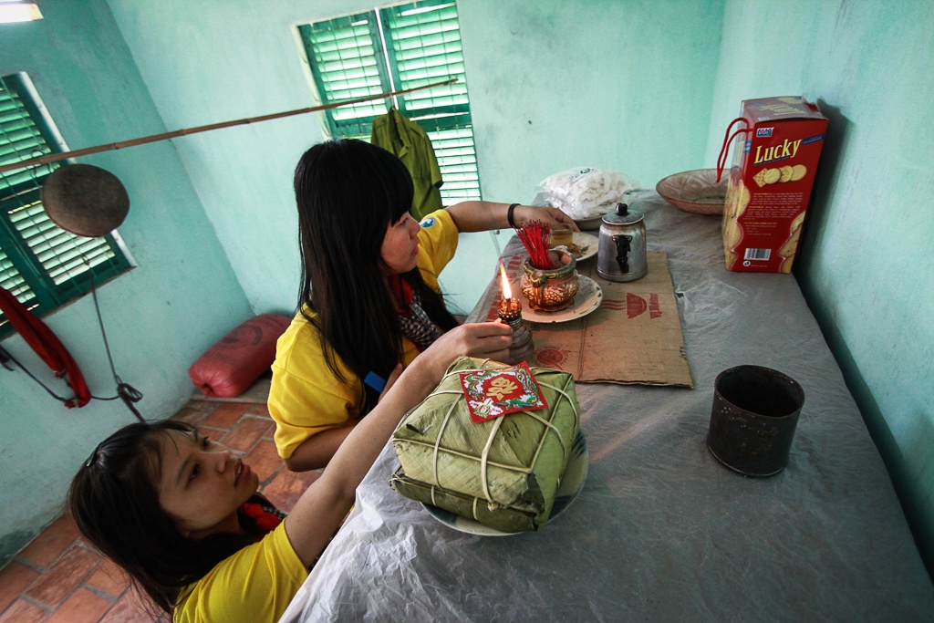 | Phúc Yên và Mỹ Ngọc, hiện là sinh viên năm 1 và năm 3 dọn dẹp bàn thờ của anh hùng liệt sĩ Nguyễn Văn Ẩn. |
