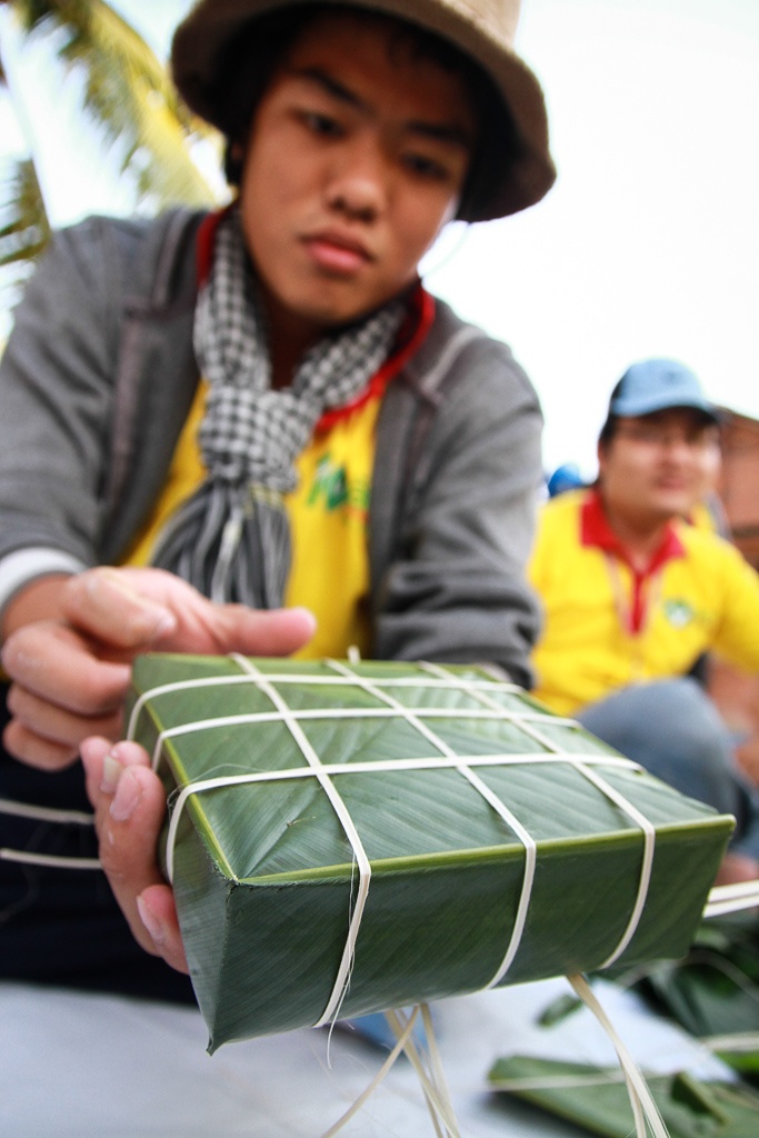 | Sinh viên gói bánh chưng để tặng bà con. Từng chiếc bánh được được gói cẩn thận. |