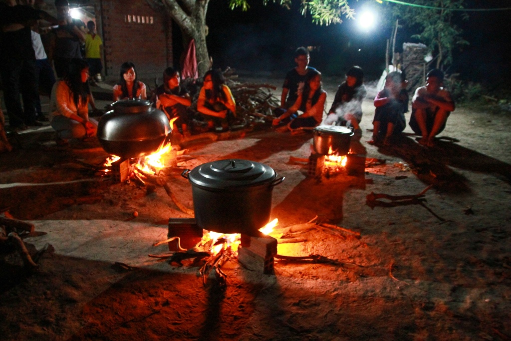 | Cả đội chia nhau thành từng nhóm nhỏ để thức đêm canh bánh chưng tại xã Long Khánh, huyện Bến Cầu, tỉnh Tây Ninh. Đây là xã nằm ở biên giới Tây Nam của Tổ quốc, giáp ranh với huyện Svay Rieng của Campuchia. |