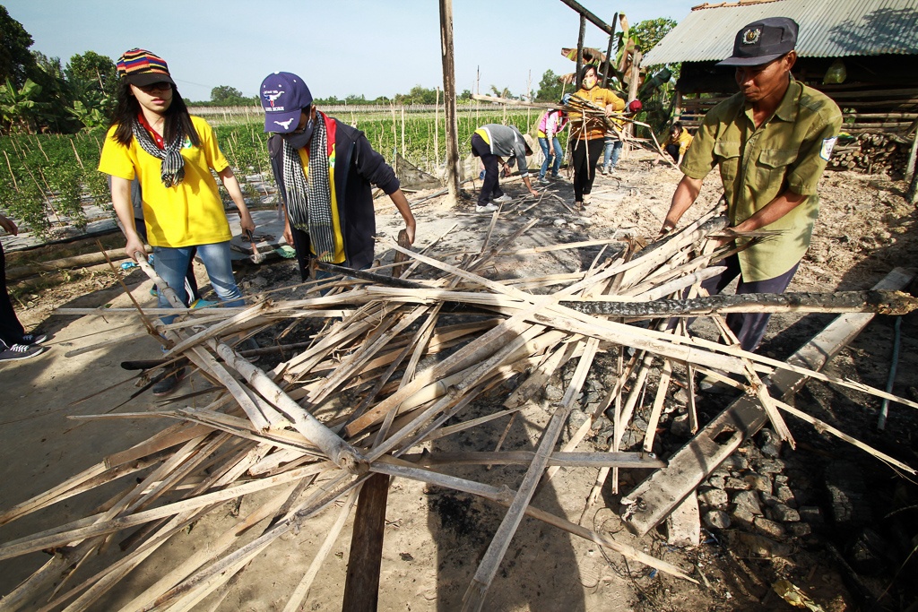 | Các sinh viên tham gia giúp một người dân trong xã dựng lại nhà bị cháy do hỏa hoạn. Đội tình nguyện đa phần là con gái nhưng mọi người đã cùng nhau hợp sức. Sau một ngày, ngôi nhà làm tạm đã được hoàn thành. |