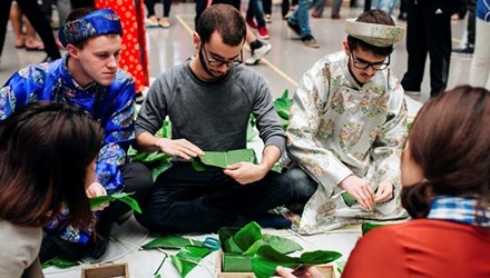 Sinh viên quốc tế hào hứng tham gia gói bánh chưng Tết. |