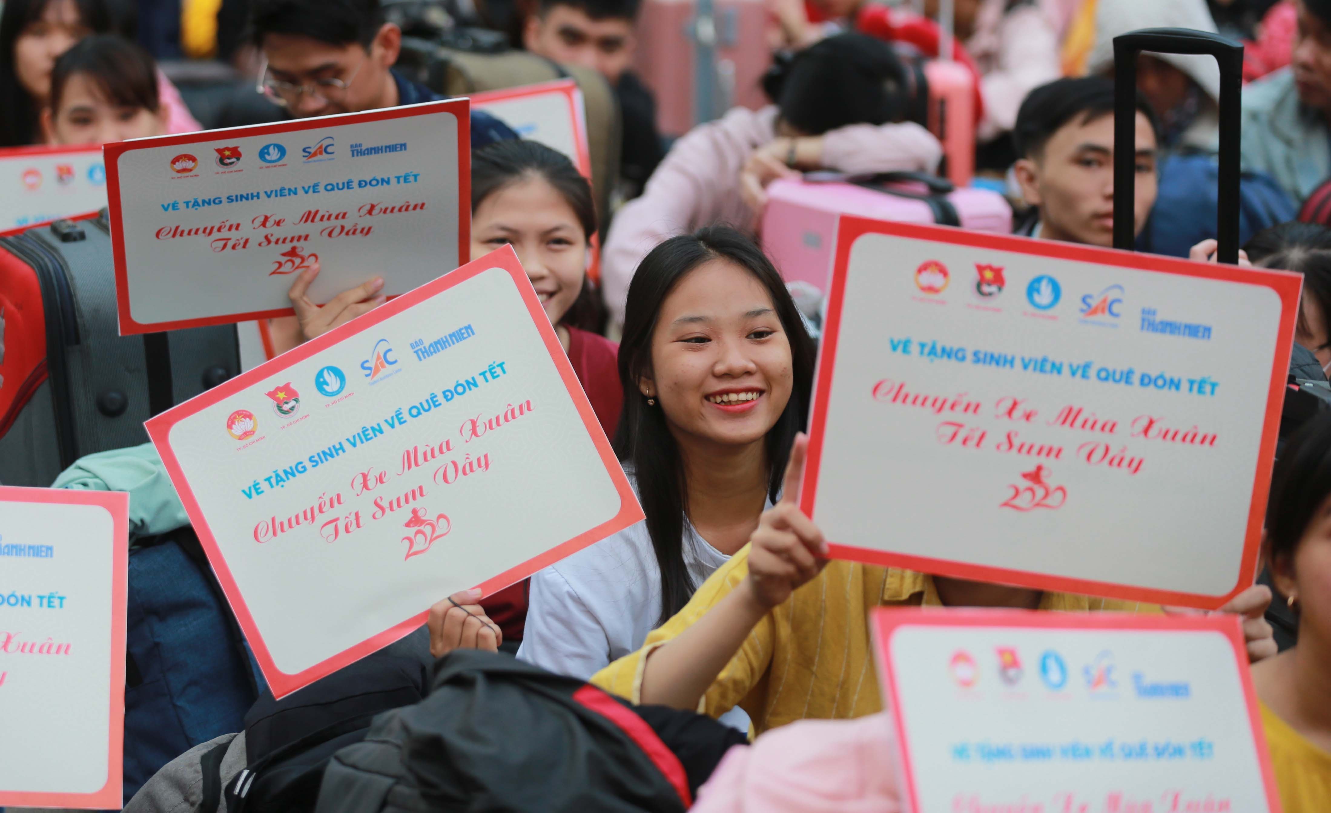 | Những bạn sinh viên vui vẻ cầm trên tay tấm vé "Chuyến xe mùa xuân - Tết sum vầy". Cùng với hoạt động chính của Thành đoàn TP.HCM, một số trường như ĐH Nông Lâm TP.HCM, ĐH Sài Gòn, ĐH Sư phạm Kỹ thuật TP.HCM cũng kêu gọi nhiều đơn vị hỗ trợ để tổ chức những chuyến xe miễn phí đưa sinh viên về quê. |