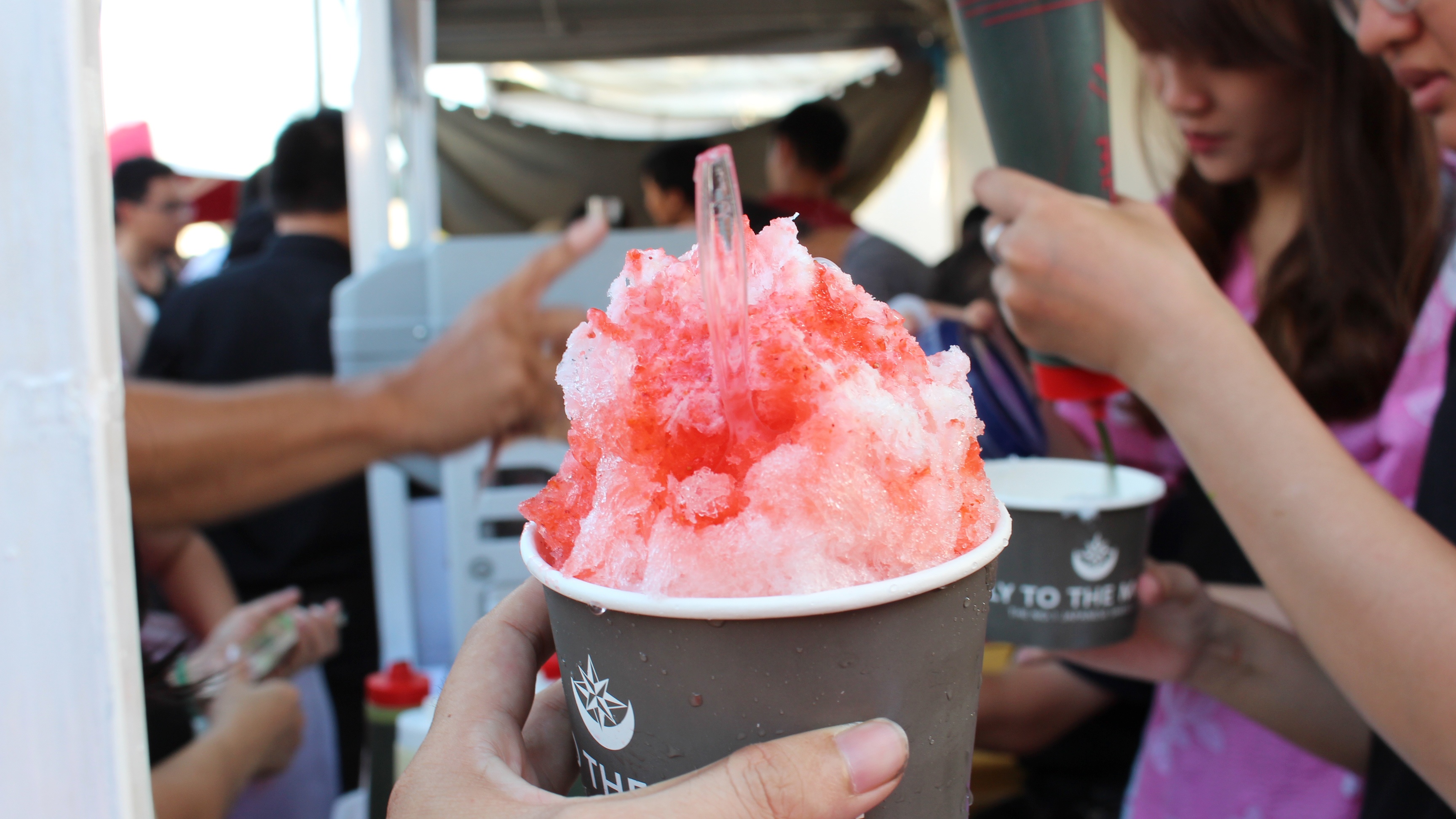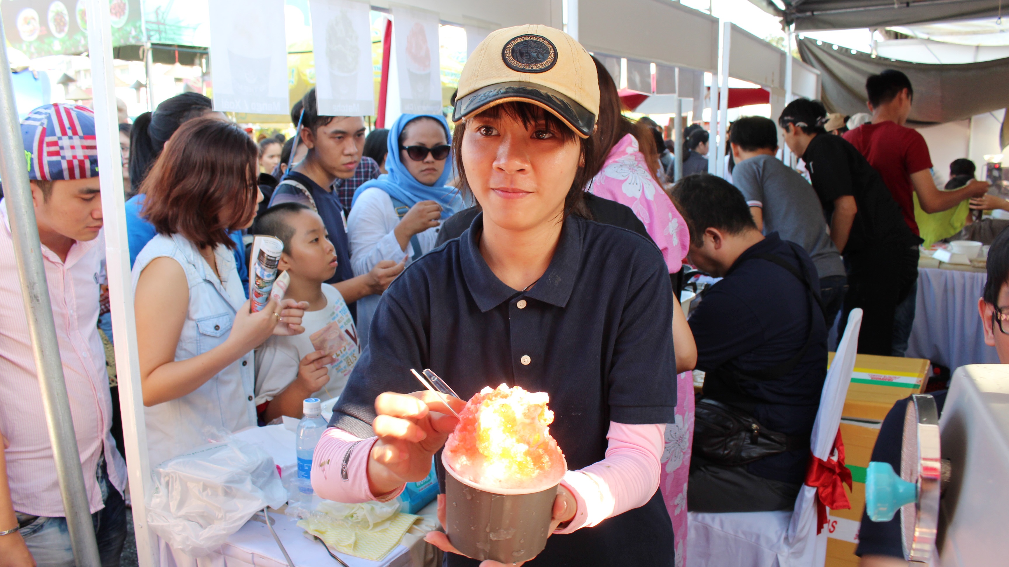 | Gian hàng này có hai quầy với hai máy bào đá và 6 nhân viên làm luôn tay luôn chân để phục vụ khách hàng. Nổi bật nhất gian hàng là cô gái xinh xắn trong bộ yukata màu hoa anh đào liên tục cho si rô, sữa lên trên "núi đá bào". |