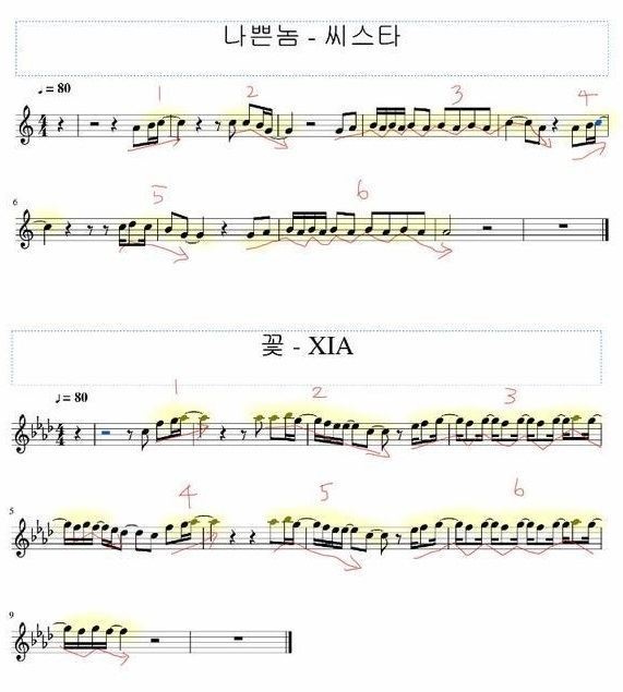 | Bản ký âm được cho là giống nhau giữa ca khúc Bad Guy của Sistar (trên) và Flower của Junsu (dưới). |