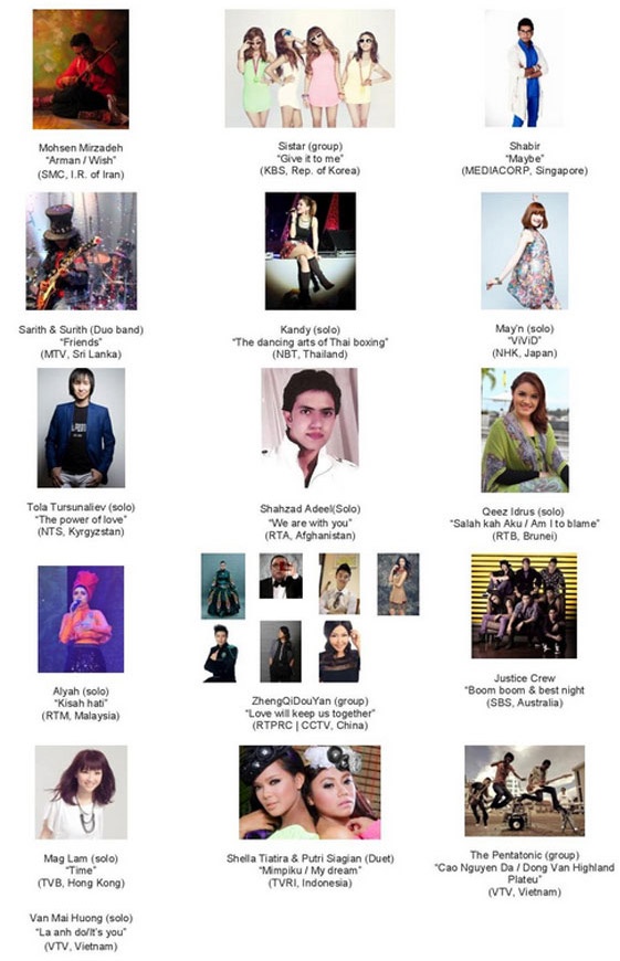 | Danh sách các nghệ sĩ biểu diễn tại ABU TV Song Festival 2013. |