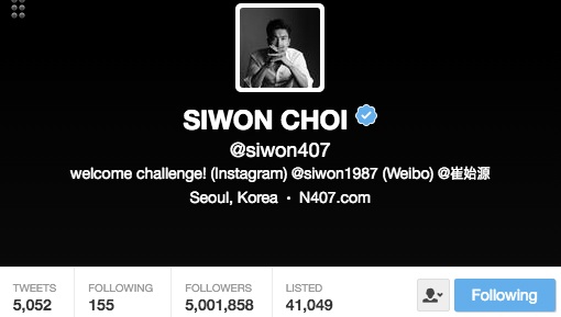 Mới đây, ngày 26/10, Choi Siwon được trang mạng xã hội nổi tiếng Twitter vinh danh vì là người Hàn Quốc đầu tiên có 5 triệu người theo dõi (follower).