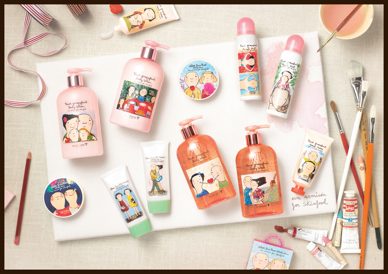 | Eva Armisen for Skinfood Limited Edition phiên bản II gồm 4 sản phẩm chăm sóc cơ thể và 2 sản phẩm trang điểm với tạo hình đáng yêu từ những bức họa của Eva Armisen |