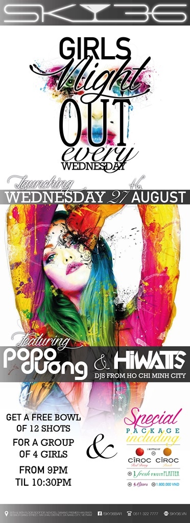Vào thứ tư hàng tuần, SKY36 sẽ tổ chức SKY36 - Girls night out. Chương trình chính thức khởi động bằng một đại tiệc hoành tráng vào ngày 27/8, với sự góp mặt của hai DJ khách mời từ TP.HCM, là DJ PoPo Dương và DJ Hiwatts. Buổi tiệc hứa hẹn sẽ mang đến màn "duo DJ" đầy ấn tượng, cùng những điệu nhảy sôi động của các vũ công chuyên nghiệp trong và ngoài nước. Ngoài ra, ban tổ chức còn chuẩn bị tiết mục biểu diễn trống nước điện tử đặc sắc, khiến mọi người hòa mình vào không gian trẻ trung, sành điệu.