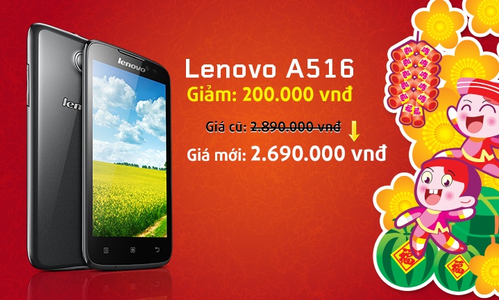 | Lenovo A516 giá tham khảo: 2,89 triệu đồng, giá mới: 2,69 triệu đồng, mức giảm: 200.000 đồng. |