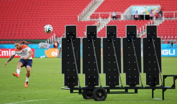 | Tiền vệ thuộc biên chế Galatasaray, Sneijder tập sút phạt với hàng rào chắn. |