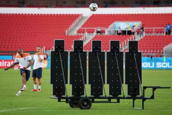 | Robben (trái) và Sneijder (phải) rủ nhau luyện sút phạt ở buổi tập nhằm chuẩn bị cho trận gặp Australia trên sân Estadio Beira-Rio ở Porto Alegre. |
