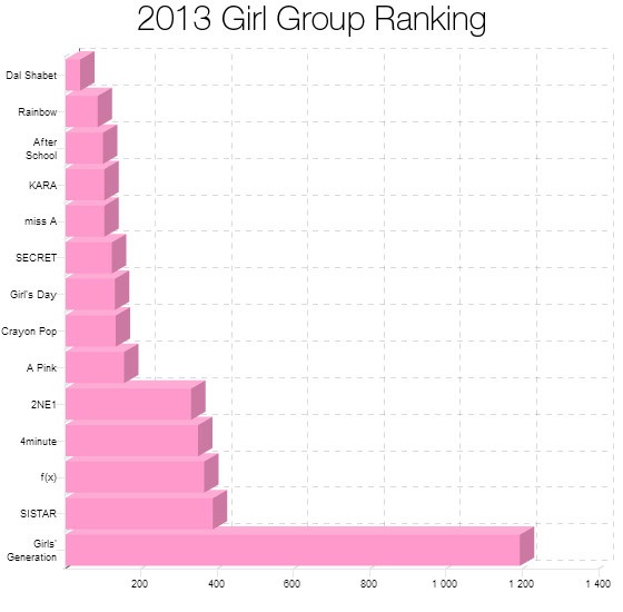Với 1.194 điểm, cao gấp 3 lần so với nhóm đứng thứ 2, SNSD vẫn là nhóm nhạc thống trị tuyệt đối Kpop. Đứng ngay sau các cô gái SNSD là Sistar, f(x), 4minute, 2NE1,...