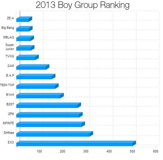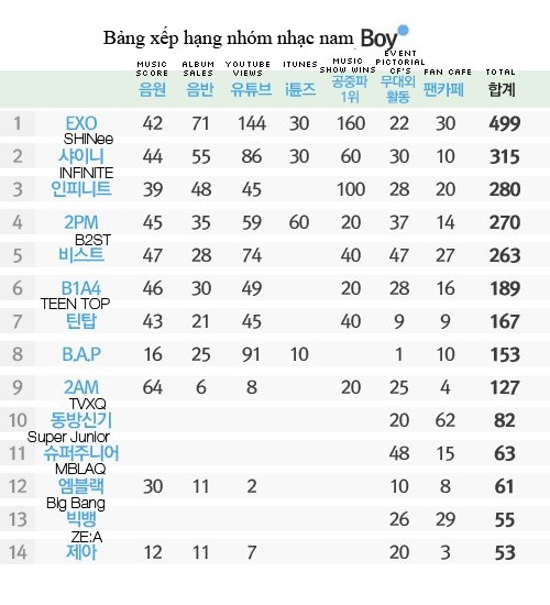 Điều bất ngờ đã xảy ra ở bảng xếp hạng dành cho nam bởi đứng ở vị trí số 1 là cái tên còn rất mới - EXO. Trong khi đó, những "lão tướng" như TVXQ, Super Junior hay Big Bang lần lượt xếp hạng 10, 11 và 13.