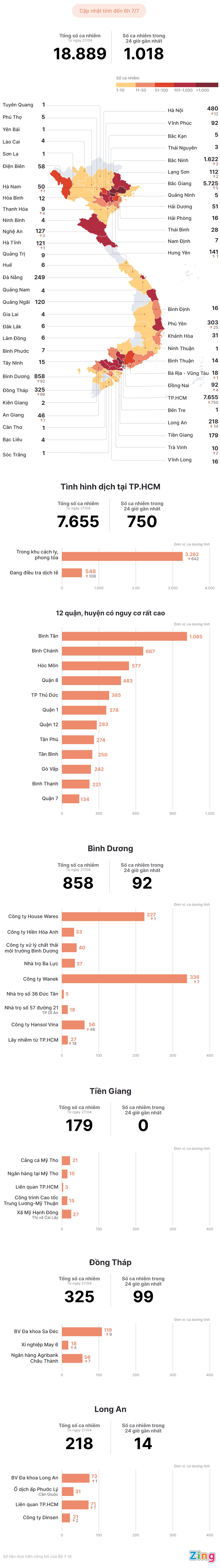 Từ 27/4 đến nay, Việt Nam ghi nhận 18.889 bệnh nhân Covid-19. Trong 24 giờ qua, TP.HCM, Bình Dương, Đồng Tháp phát hiện số lượng lớn ca mắc mới.