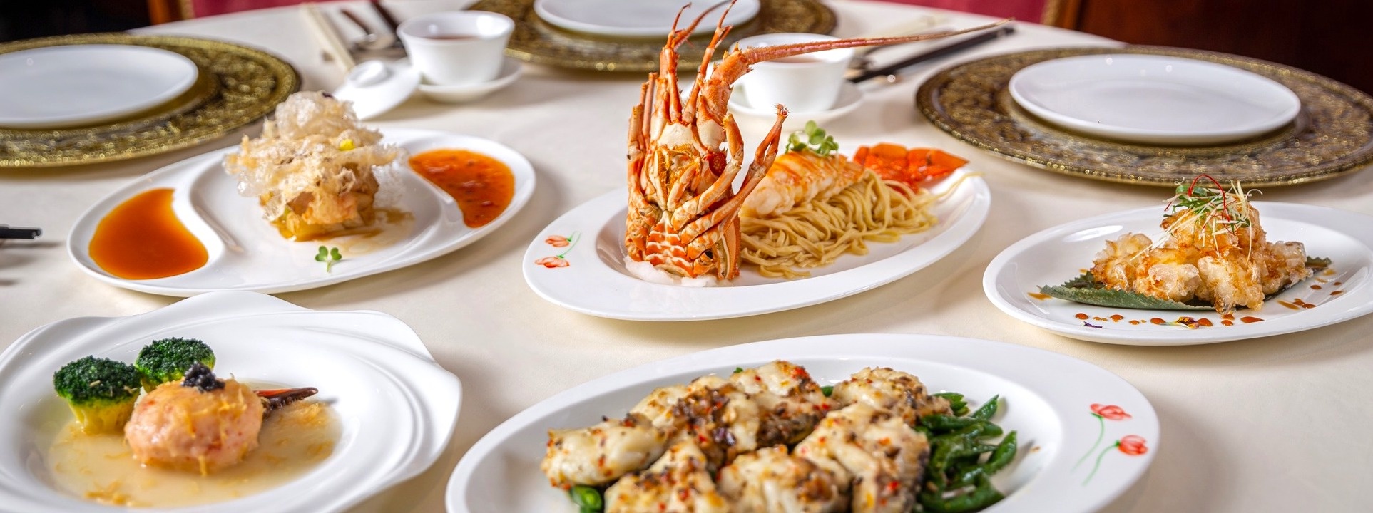 Thực đơn gọi món đặc sắc của nhà hàng giới thiệu hành trình trải nghiệm ẩm thực cao cấp với những món ăn nổi tiếng như bào ngư, hải sâm, canh tổ yến sào, thịt heo quay mật ong, cá mú hấp kiểu Hong Kong và món kinh điển của nhà hàng là khoai môn thái sợi chiên giòn và đậu phộng.