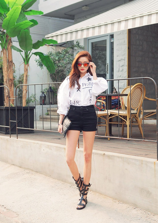 | Sơ mi boxy khỏe khoắn với họa tiết lạ mắt mix kèm shorts và sandals chiến binh. |