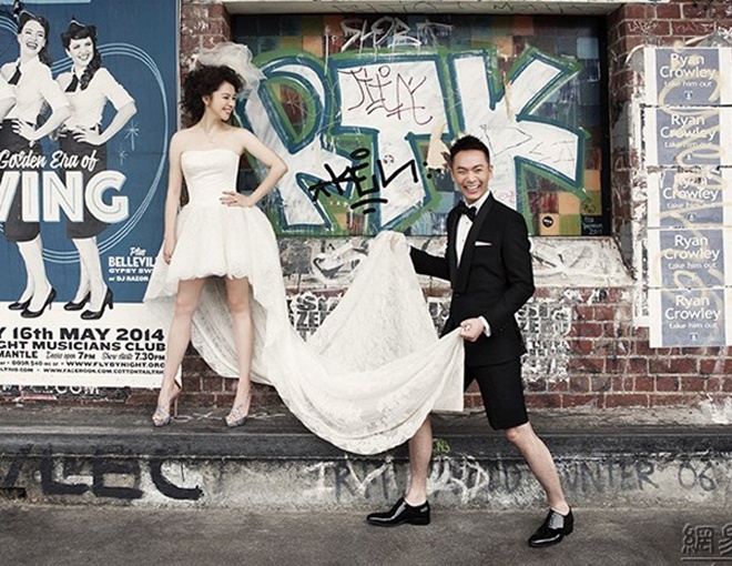 | Dù đã bước qua lứa tuổi 40, nhưng chú rể Ngô Kinh vẫn không ngại tạo dáng hài hước cùng cô dâu Tôn Nam trong những bức ảnh cưới vừa ngọt ngào vừa tươi vui. |