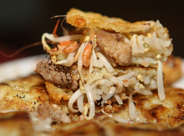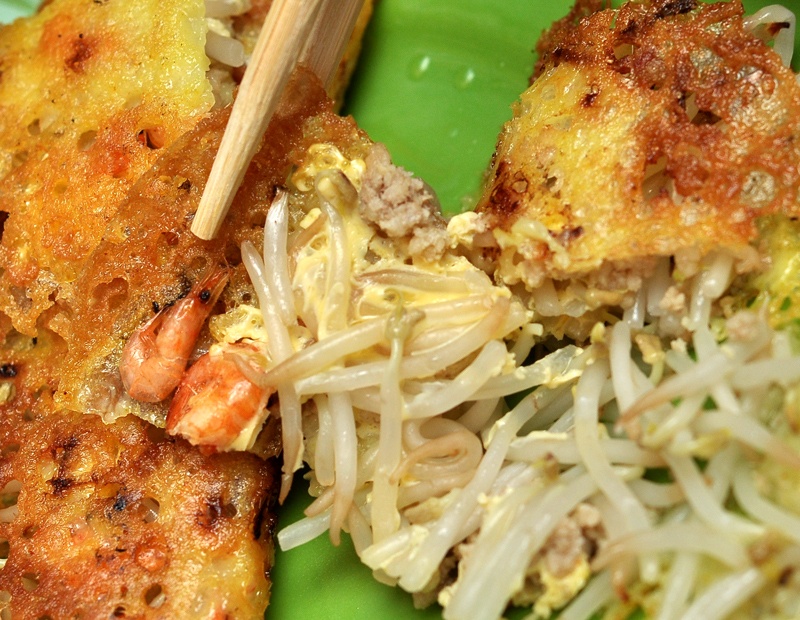 Còn bánh xèo có lẽ chưa ấn tượng ngoài việc nguyên liệu hơi khác biệt mọi nơi. Chiếc bánh nhỏ nhỏ, vỏ bánh trông rõ có phủ lớp trứng mỏng bên trong, ngoài giá đỗ với vài con tôm nhỏ, chủ quán sử dụng thit heo băm chứ không cho thịt bò. Không quá ngon song cũng dễ ăn. Về độ thơm ngon, đầy đặn thì bánh xèo ở đây thua quán “hàng xóm”.
