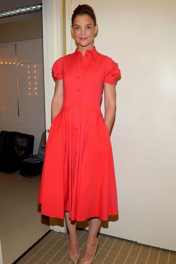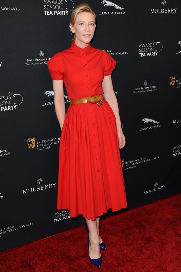 7. Cate Blanchett đã rất thông minh khi dùng một chiếc belt nâu định hình vòng eo và đôi giày xanh dương nổi bật hợp gu cùng chiếc váy đỏ quyến rũ. Chính điều đó đã làm set đồ của cô chiến thắng set đồ xu hướng minimalsim (đơn giản) của Katie Holmes.