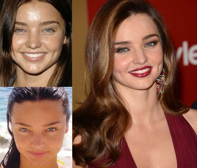 | Miranda Kerr khi không trang điểm lộ ra làn da không đều màu cũng đôi mắt quầng thâm. Những điểm này được che giấu tài tình khi cựu thiên thần Victoria's Secret trang điểm. |