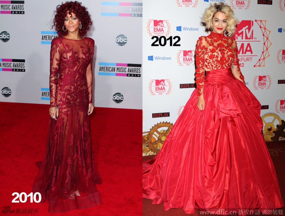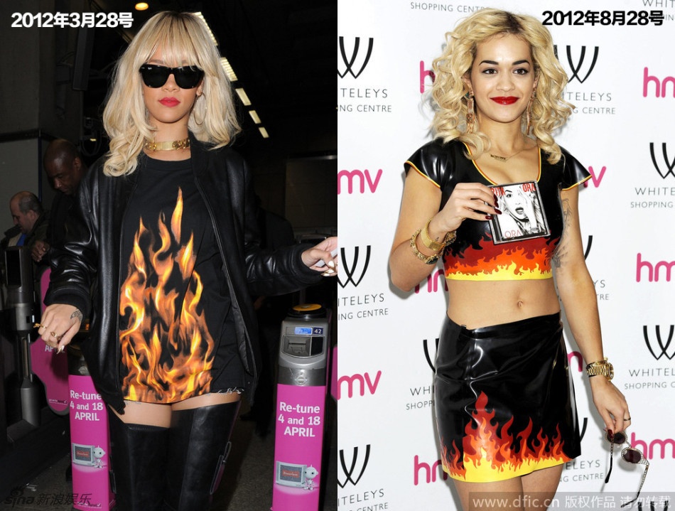 | Chiếc váy được Rihanna mặc hồi tháng 2 đã được Rita Ora diện lại tại một sự kiện hồi tháng 6. |