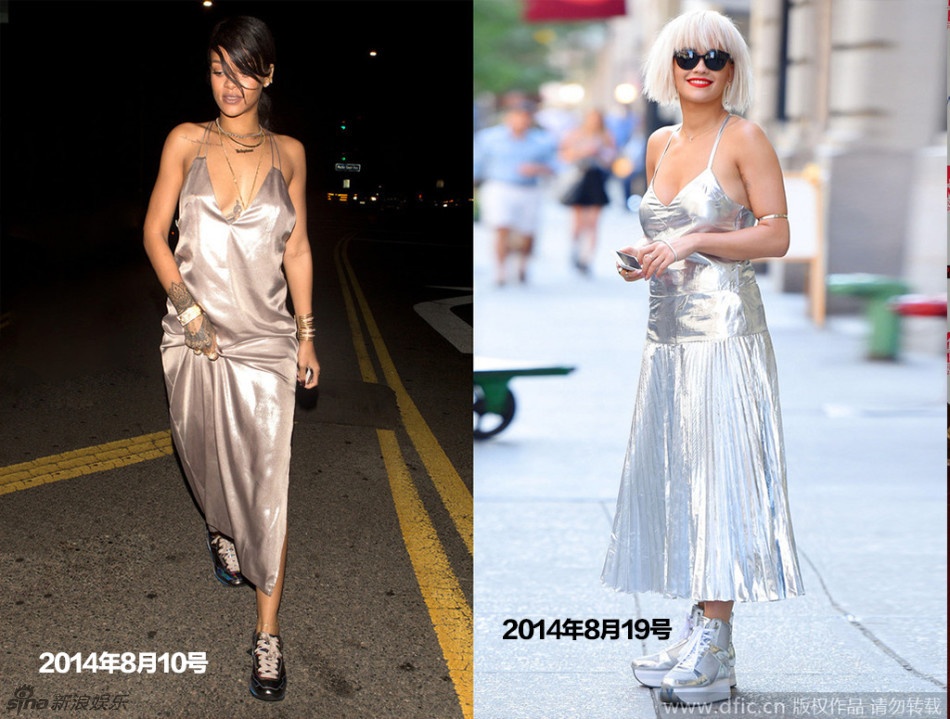 | Ngày 10/8, Rihanna ra đường với mốt váy ngủ. Chỉ 9 ngày sau đó, Rita Ora cũng gây chú ý bằng một bộ váy ánh kim tương tự. |