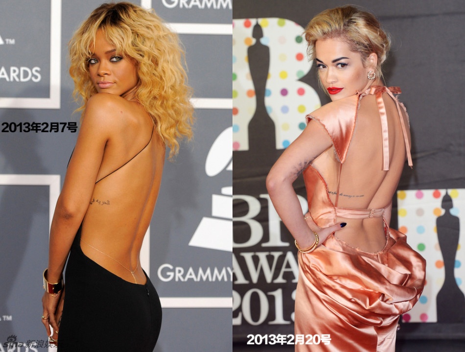 | Ngay cả cách "khoe lưng" cũng như vị trí hình xăm của Rihanna và Rita Ora cũng giống nhau. |