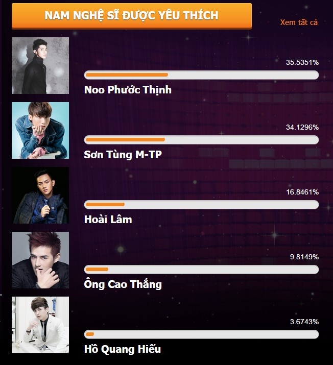 Sơn Tùng M-TP vừa lọt vào top 5 Nam nghệ sĩ được yêu thích tại giải thưởng âm nhạc trực tuyến Zing Music Awards 2014. Tại top 5, ngoài Sơn Tùng còn có ca sĩ Noo Phước Thịnh, Hoài Lâm, Ông Cao Thắng và Hồ Quang Hiếu. Đây là 5 chàng trai có hoạt động âm nhạc nổi bật trong năm, nhất là trên lĩnh vực trực tuyến. Nhìn vào bảng kết quả Top 5 có thể thấy hạng mục Nam nghệ sĩ được yêu thích năm nay có nhiều khả năng chỉ rơi vào một trong hai ca sĩ Sơn Tùng và Noo Phước Thịnh với số phiếu bình chọn vượt trội hơn 3 ca sĩ còn lại.