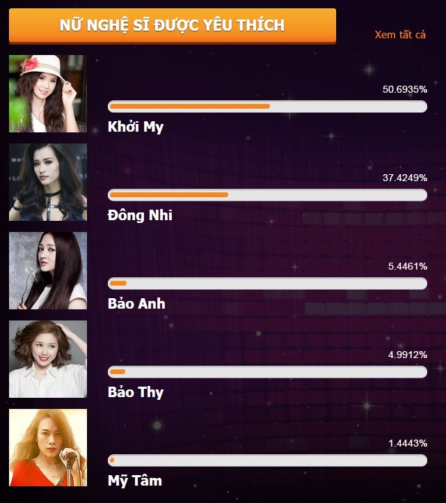 Tại top 5 Nữ nghệ sĩ được yêu thích có thể điểm danh các gương mặt như Khởi My, Đông Nhi, Bảo Anh, Bảo Thy và Mỹ Tâm. Điều bất ngờ là Mỹ Tâm lại có số phiếu bình chọn khá thấp so với hai đàn em Khởi My và Đông Nhi.