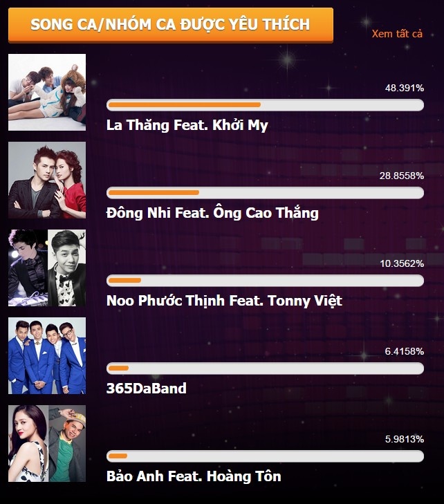 Top 5 Song ca/ nhóm ca được yêu thích khá thú vị với sự kết hợp của La Thăng và Khởi My, Đông Nhi và Ông Cao Thắng, Noo Phước Thịnh và Tony Việt, nhóm 365, Bảo Anh và Hoàng Tôn.