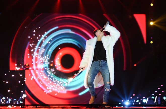 | Sơn Tùng trên sân khấu live show M-TP Ambition - Chuyến bay đầu tiên tại Hà Nội. |
