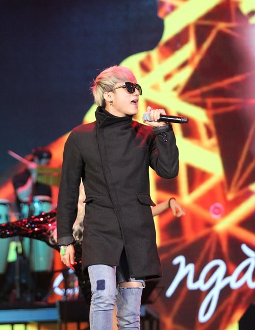 Gu thời trang hiện đại, cá tính còn được anh ứng dụng khá hiệu quả khi bước lên sân khấu. Tuy nhiên, trang phục sẽ được biến hóa với cách mix sang trọng và tinh tế hơn. Trong ảnh là bộ cánh phủi bụi, phối hợp ăn ý cùng áo dạ nam tính.