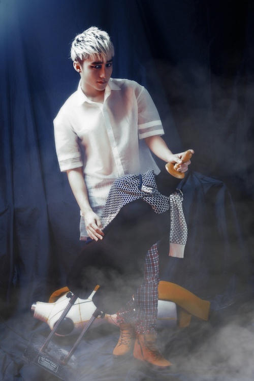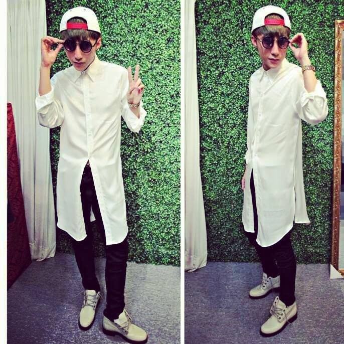 Chàng sinh viên năm đầu trường Nhạc viện TP.HCM bắt đầu quan tâm đến những chiếc sơ-mi dáng dài phá cách. Mix trang phục thê hiện sự sành mốt với gam màu trắng đen.