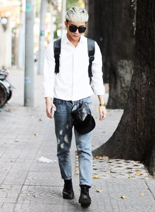 Trang phục dần có sự đầu tư hơn về kiểu cách. Phụ kiện balo,mũ mix khá ăn ý cùng áo sơ-mi nam tính.