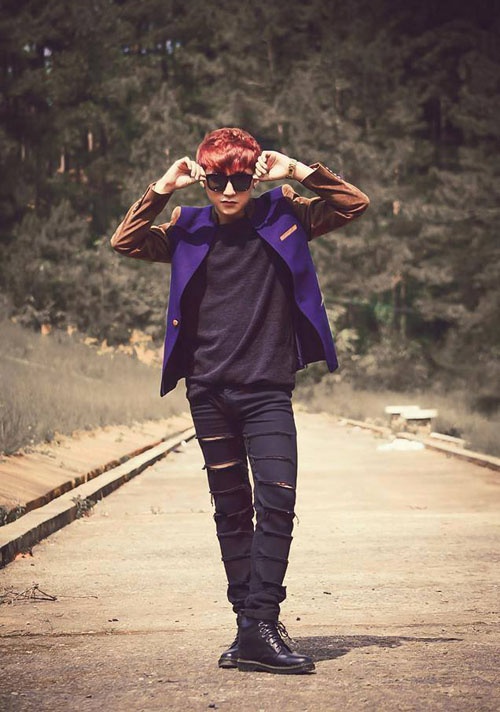 Chàng ca sĩ trẻ không ngần ngại diện yếm denim, phong cách thường rất được các nam ca sĩ Hàn Quốc yêu thích.