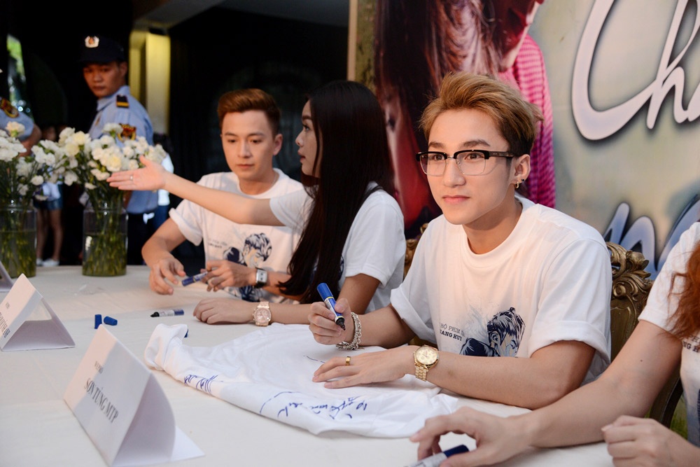 Dù hơn Sơn Tùng gần chục tuổi nhưng khi đứng cạnh nam ca sĩ gốc Thái Bình, cặp đôi không có sự chênh lệch tuổi tác. Hai người liên tục thì thầm to nhỏ suốt buổi ký tặng fan.