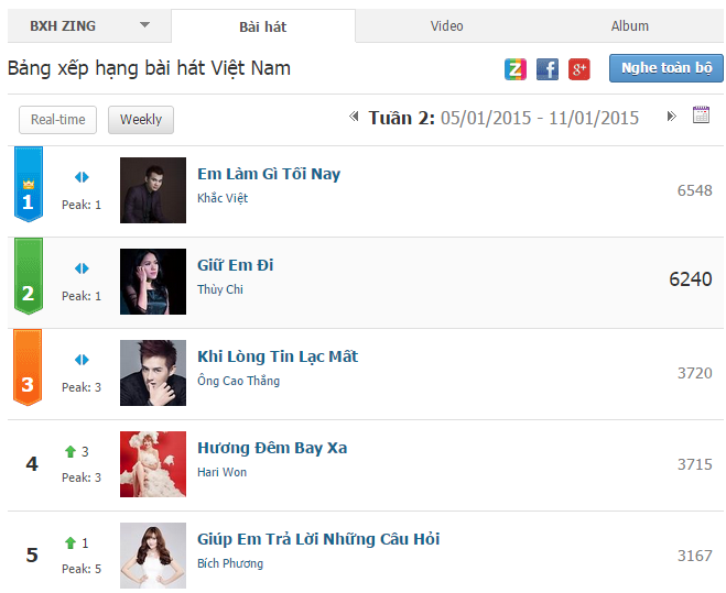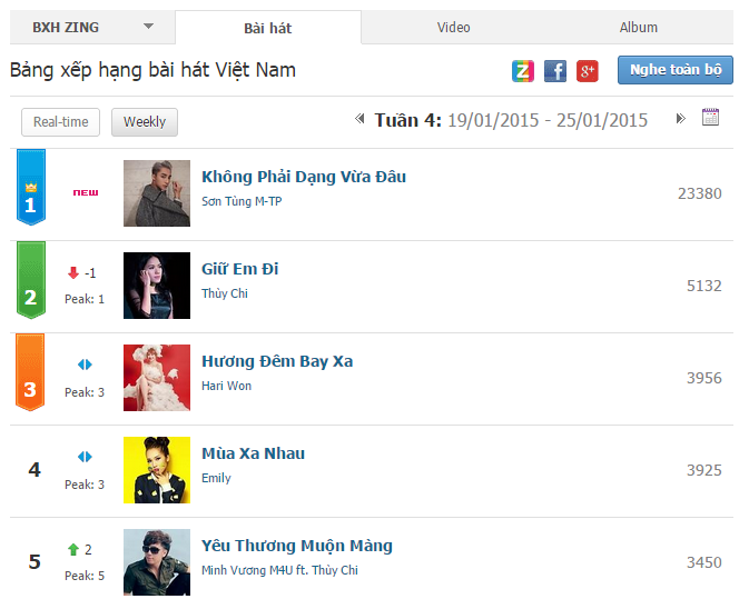 Sơn Tùng M-TP bắt đầu chiếm ngôi từ tuần 4 và tiếp tục lấn lướt Thùy Chi ở cuối tháng 1. Nhiều khả năng nam ca sĩ Em của ngày hôm qua còn chễm chệ ở ngôi đầu bảng ca khúc trong thời gian tới. Trước đó, ở tuần thứ 2 của tháng 1, vị trí quán quân thuộc về Khắc Việt với hit Em làm gì tối nay. Sau đó sang tuần 3, Thùy Chi lật đổ ngôi đầu của đối thủ để chiếm lấy ngôi vị quán quân với hit Giữ em đi.