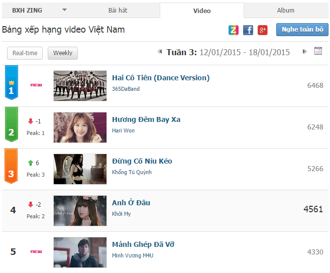 Hương đêm bay xa của Hari Won tạo được hiệu ứng tốt nên đã tăng vọt lên vị trí 3 và 4 trong suốt 2 tuần liên tiếp. Tuy nhiên, bạn gái của Đinh Tiến Đạt không cầm cự được quá lâu, dẫu vậy cô vẫn có mặt ở top 5. Mùa xa nhau của Emily nhận được phản hồi tích cực và đang có dấu hiệu tăng dần. Có khi của Hoài Lâm cũng xuất hiện ở top 5 ở tuần cuối cùng của tháng 1.