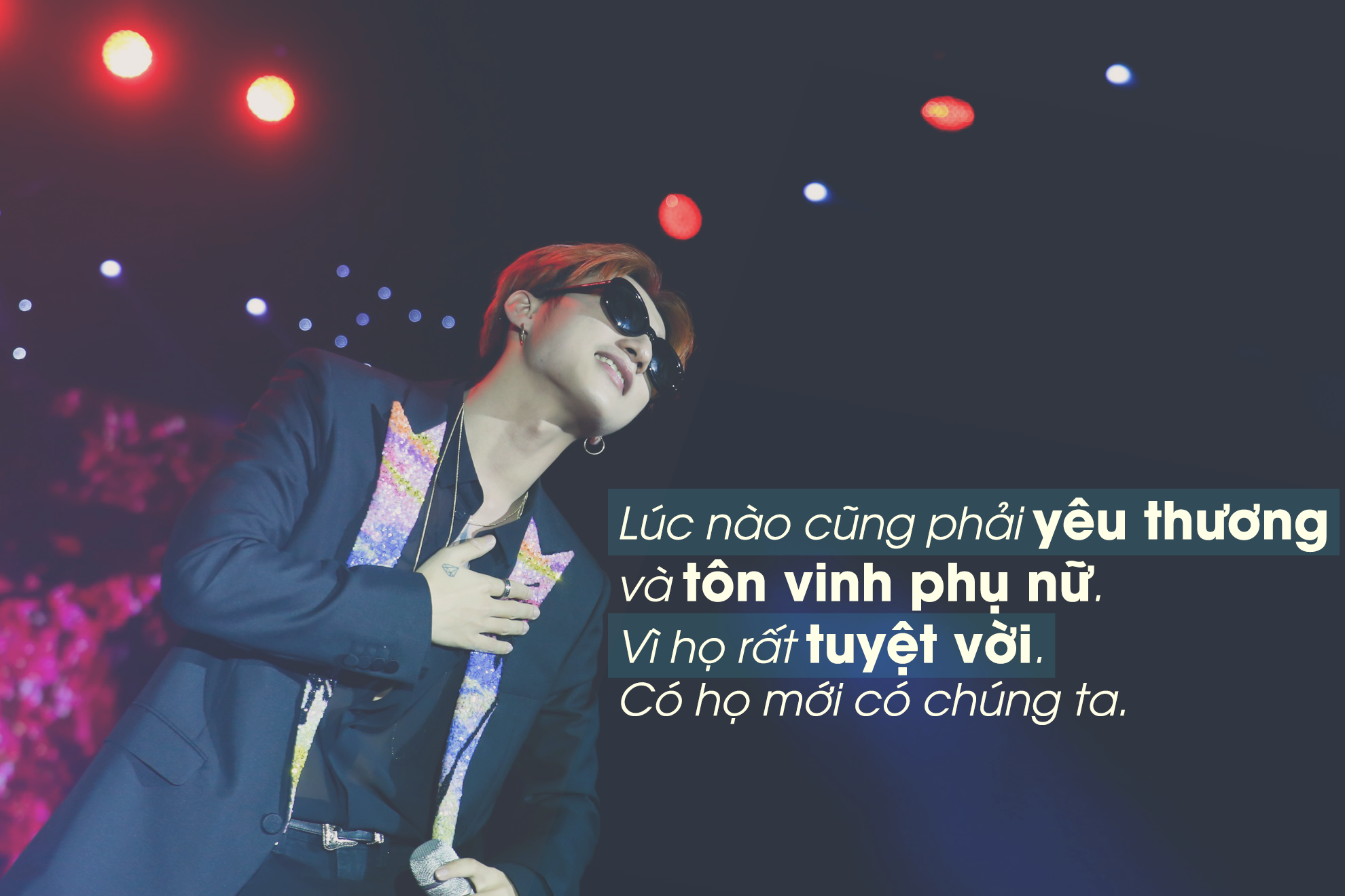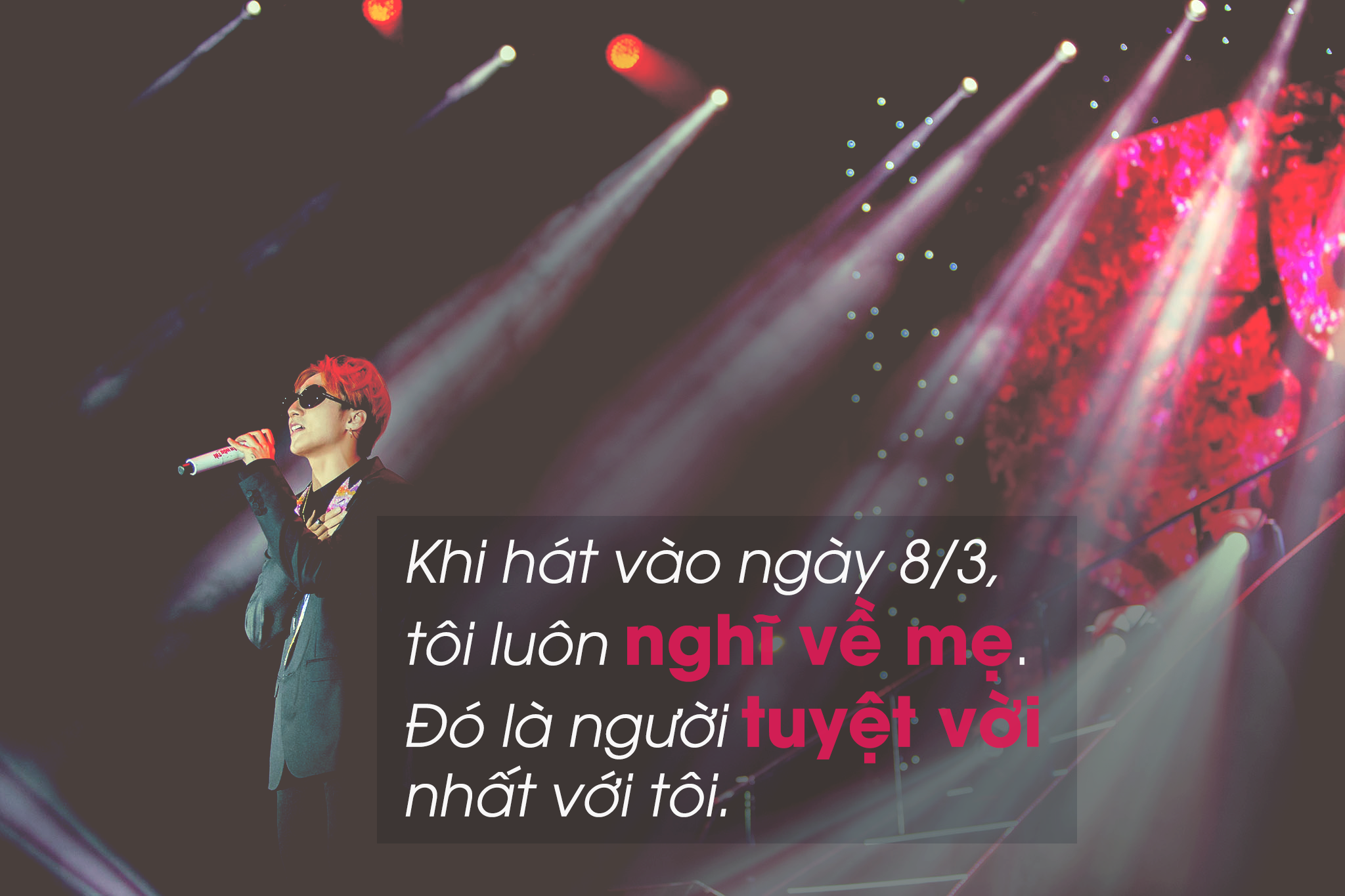 | Trò chuyện bên lề đêm nhạc “Cám ơn vẻ đẹp Việt”, sự kiện tôn vinh phụ nữ vừa diễn ra tại TP HCM, khi được hỏi Sơn Tùng M-TP nghĩ về ai trong lúc hát, chàng trai này không ngần ngại nói rằng đó chính là mẹ. Anh mong muốn mẹ cảm thấy thật hạnh phúc vào dịp Quốc tế Phụ nữ cũng như tất cả những ngày còn lại. |