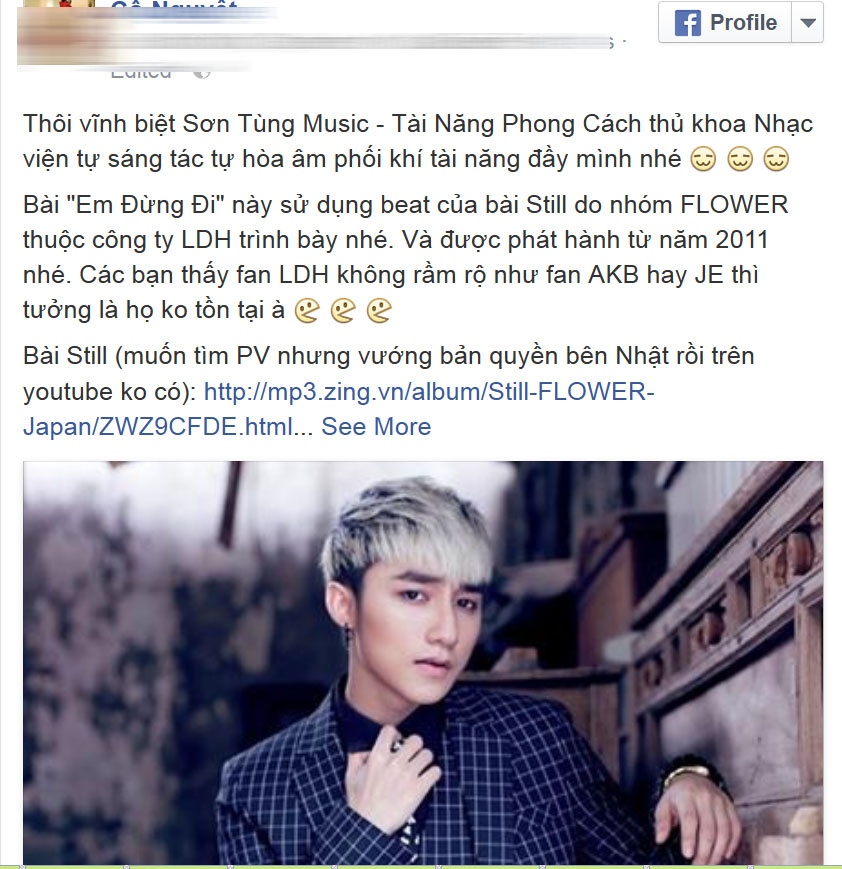 | Khán giả tố ca khúc Em đừng đi của Sơn Tùng M-TP giống với ca khúc Still của nhóm nhạc Nhật Bản. |