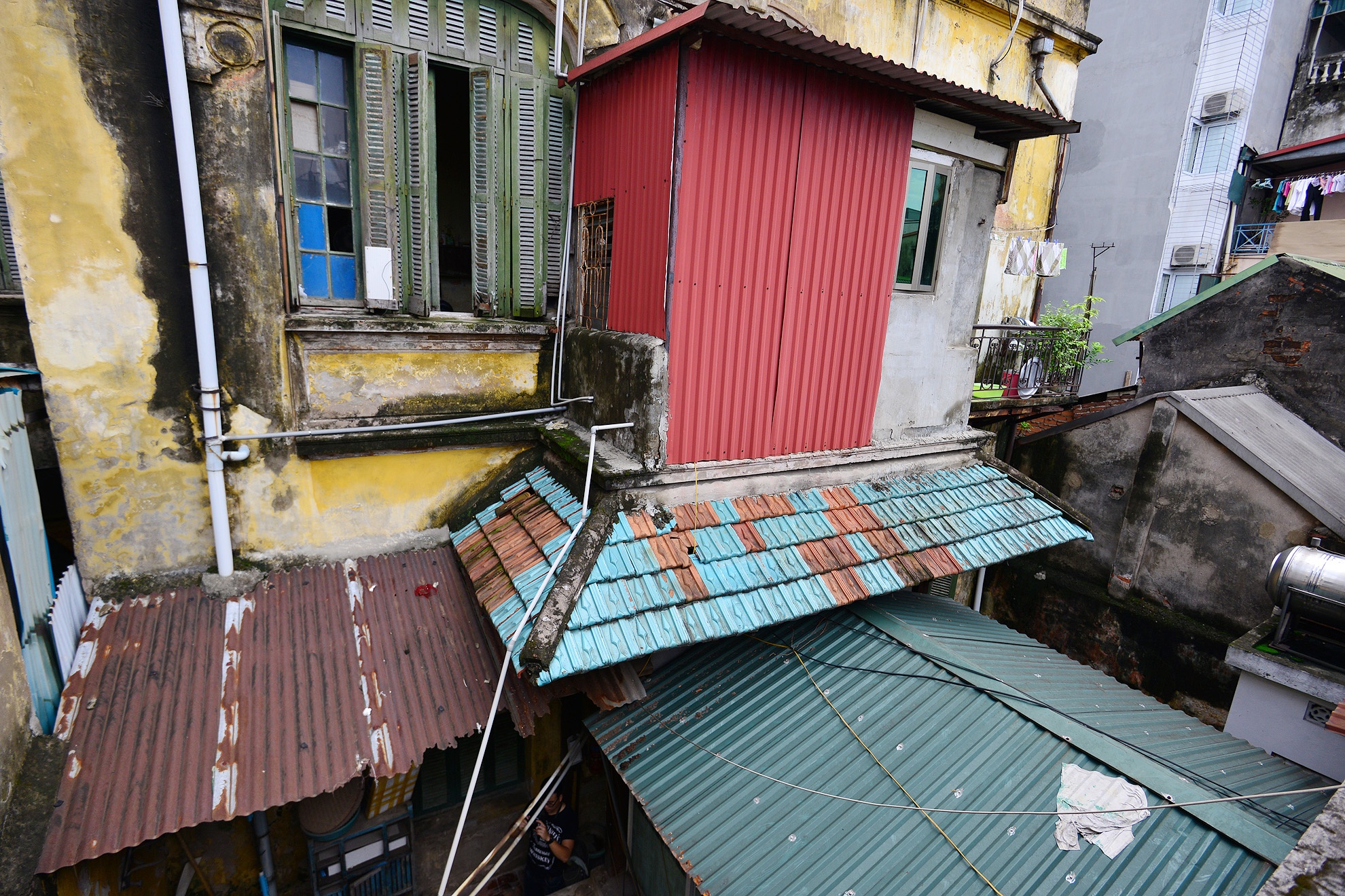 | Tòa nhà bị chia nhỏ cho nhiều hộ gia đình cùng chung sống từ thời bao cấp. Cửa ra vào bằng gỗ đã mục nát, thậm chí có hộ dùng cót ép để che tạm lối ra vào. |