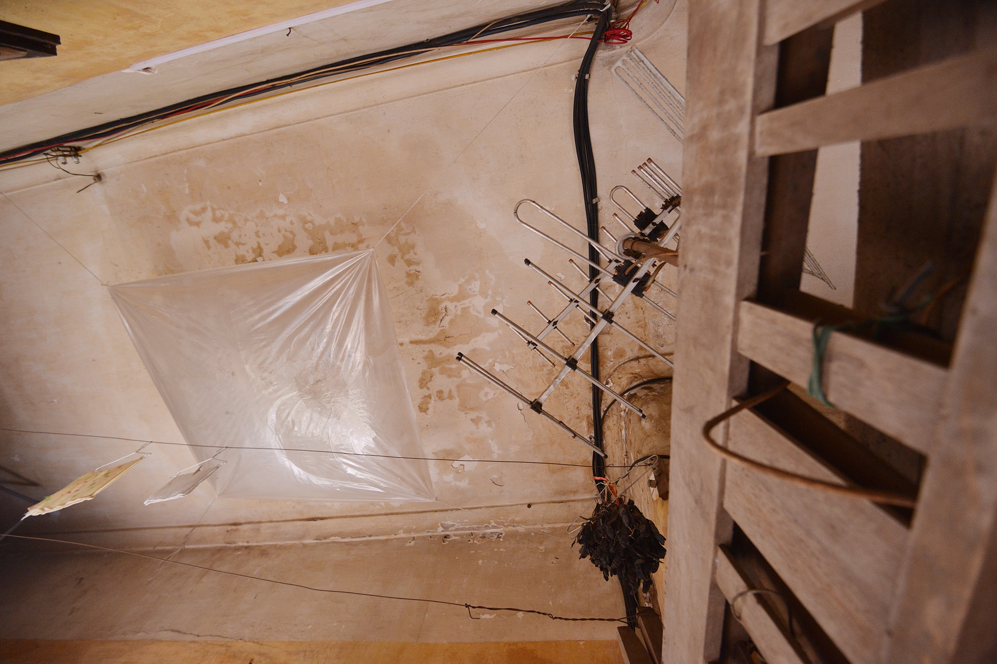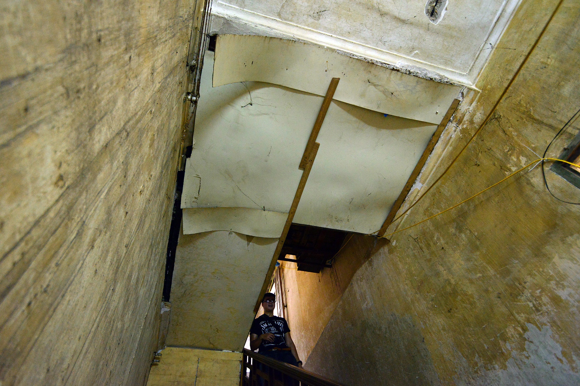 Trần nhà phía trên cầu thang lên xuống bị nứt, người dân phải dùng tấm nhựa tổng hợp để che lại. "Đây là vết nứt từ những năm 1960", một cư dân cho biết.