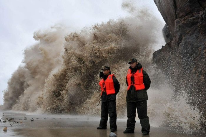 | Nhiều người hiếu kỳ liều lĩnh chụp sóng dữ. Theo cơ quan khí tượng thủy văn Trung Quốc, cơn bão Fitow sẽ đổ bộ và ảnh hưởng tới 5 tỉnh của Trung Quốc trong vòng 3 ngày tới. Ảnh: BBC. |