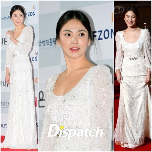 Ngọc nữ xứ Hàn tỏa sáng với nụ cười đẹp như thiên thần. Chiếc váy trắng dài tha thướt toát lên nét đẹp kín đáo mà vẫn gợi cảm. Cho dù có nhiều người đẹp khác khoe vòng một lộ liễu để gây chú ý cũng không thể sánh bằng Song Hye Kyo.