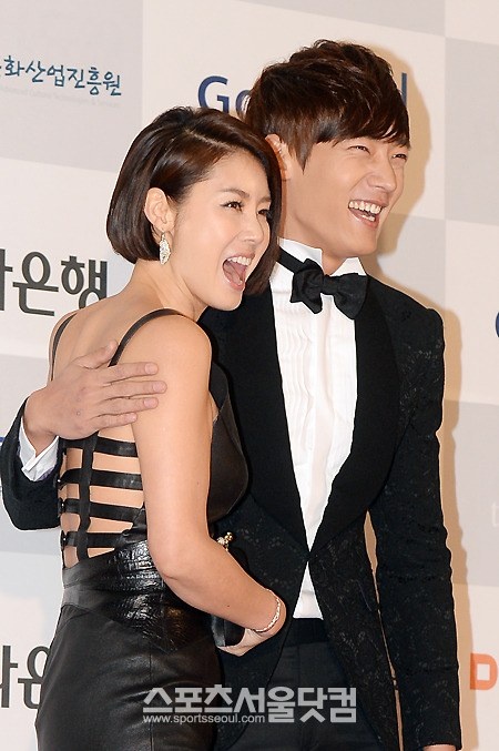 | Kim Sung Ryung (vai mẹ của Lee Min Ho trong Những người thừa kế) và Choi Jin Hyuk (vai anh trai Lee Min Ho) cười rạng rỡ trên thảm đỏ. |