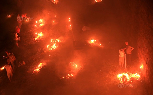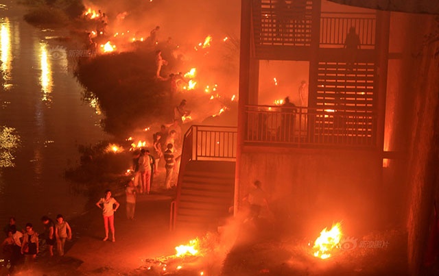Người dân thành phố Đạt Châu, Tứ Xuyên đốt hàng trăm đống lửa bên bờ sông vào tối 24/8 nhân dịp "Lễ hội Ma" khiến khu vực này sáng rực và gây ô nhiễm không khí.